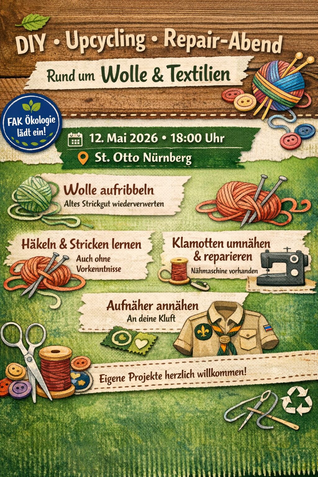 Upcycling- und Repair-Abend rund um das Thema Wolle & Textilien ein!